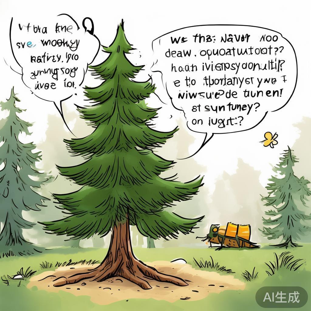 小虫子话很多,询问小松树的名字、树冠有什么、太阳是否刺眼、喜欢不喜欢唱歌等等。这些问题在小松树看来都显得幼稚可笑。