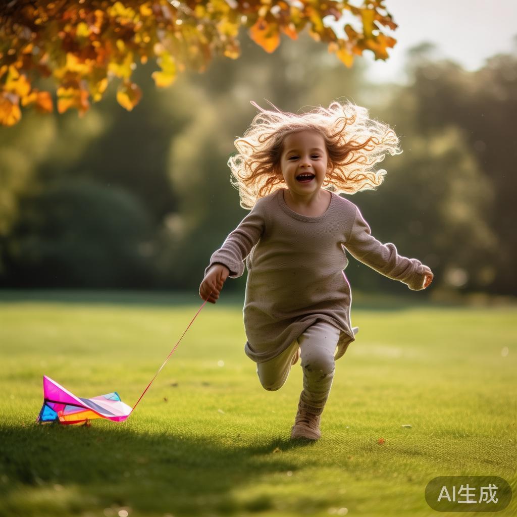 不远处,一个小女孩追着风筝,在草坪上欢快地奔跑,笑声清脆如银铃,打破了初秋的宁静。突然,风筝的一角被树枝卡住了,她焦急地用小手拽扯,满脸的不甘与无奈,这份纯真让人忍不住莞尔。