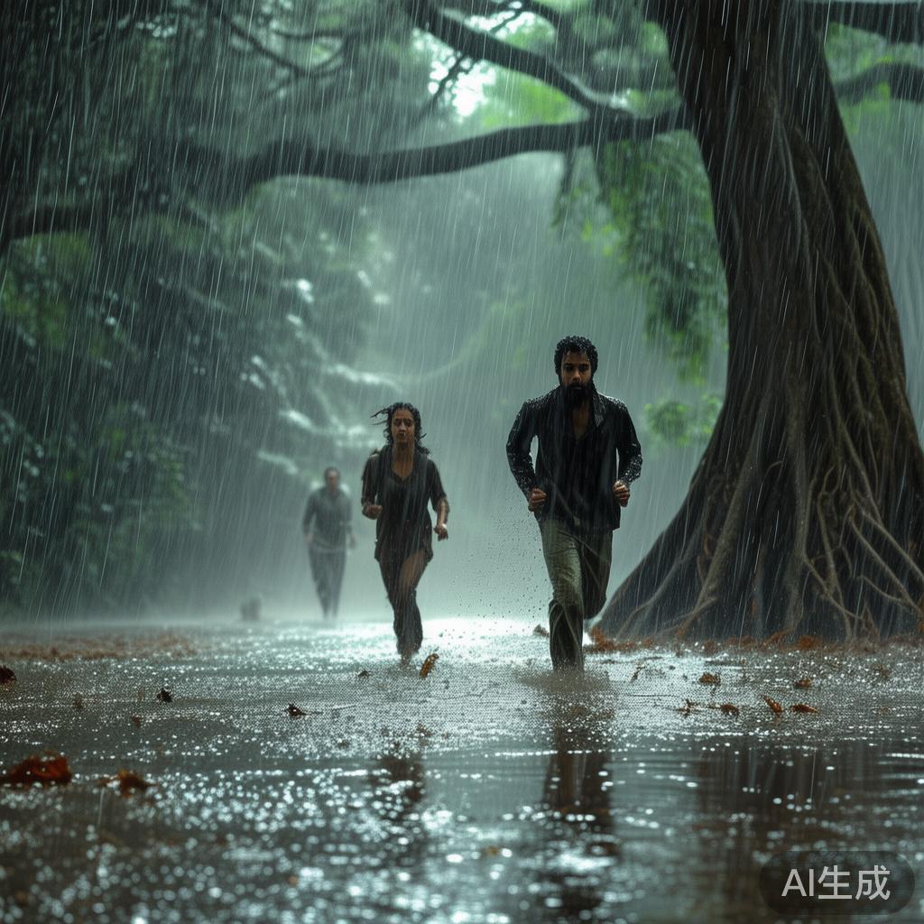 两人在暴雨中狂奔,心跳加速,如同被冲刷的枝叶随风飞舞。尽管四周充满了恐惧与不确定,但是梅子从阿明的眼中看到了勇敢与坚持,那一刻,心中的焦虑似乎有所减缓。终于,他们找到了一个躲雨的庇护所——一棵巨大的榕树,其粗壮的根系恰好为他们遮挡住风雨。